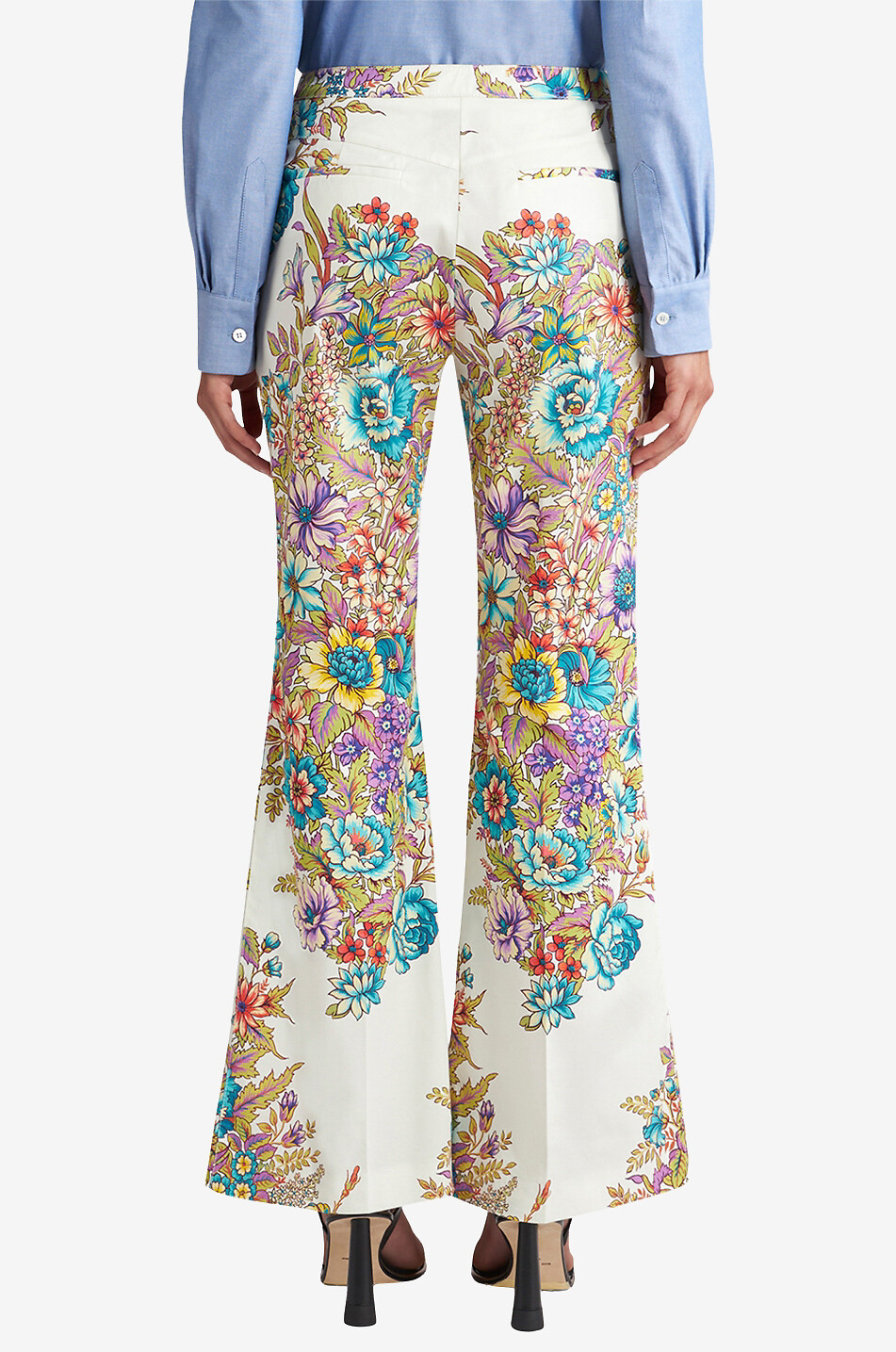 Die Ära der Flower Power feiert ihr Comeback in Ihrer Frühlingsgarderobe mit dieser Hose von ETRO. Die Hose mit dem schmeichelhaften Schnitt der 70er Jahre ist aus leichtem Baumwoll-Gabardine mit Stretchanteil gefertigt und mit farbenfrohen Blumensträussen verziert. Machen Sie sie zum Highlight Ihres Outfits, und wählen Sie dazu eine einfarbige Oversize-Bluse und ein Paar minimalistische Pantoletten.