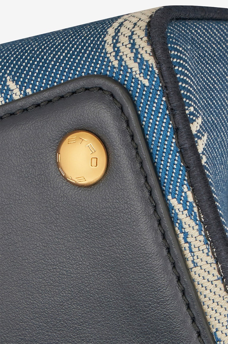 Inspiriert von der Welt der Nautik ist diese hübsche Schultertasche von ETRO in Segelform aus blauem Baumwoll-Jacquard mit weissen Wellen - damit Sie sich auch nur im Traum an die Küste versetzen können. Der breite, abnehmbare Schultergurt aus Stoff ist auf einer Seite mit dreifarbigen Streifen und auf der anderen Seite mit dem Logo des Mailänder Modehauses verziert. Das Fach mit goldfarbenem Metallverschluss ist mit einem abnehmbaren Reissverschlussmäppchen aus glattem Leder ausgestattet.