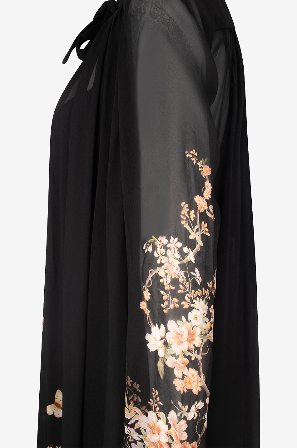 Das Mailänder Haus ETRO entführt Sie mit diesem langen Empire-Kleid in das Reich der aufgehenden Sonne. Das leichte, fliessende Kleid ist aus Seide gefertigt und mit japanisch angehauchten Blumenmotiven verziert. Die weiten Kimonoärmel unterstreichen diesen Effekt. Wir lieben die schmeichelhafte Empire-Taille und den tiefen V-Ausschnitt. Tragen Sie Ihr Kleid am Abend mit einem Paar minimalistischer Sandalen - oder Ballerinas für mehr Komfort - und denken Sie an Perlenschmuck und eine glamouröse Clutch.