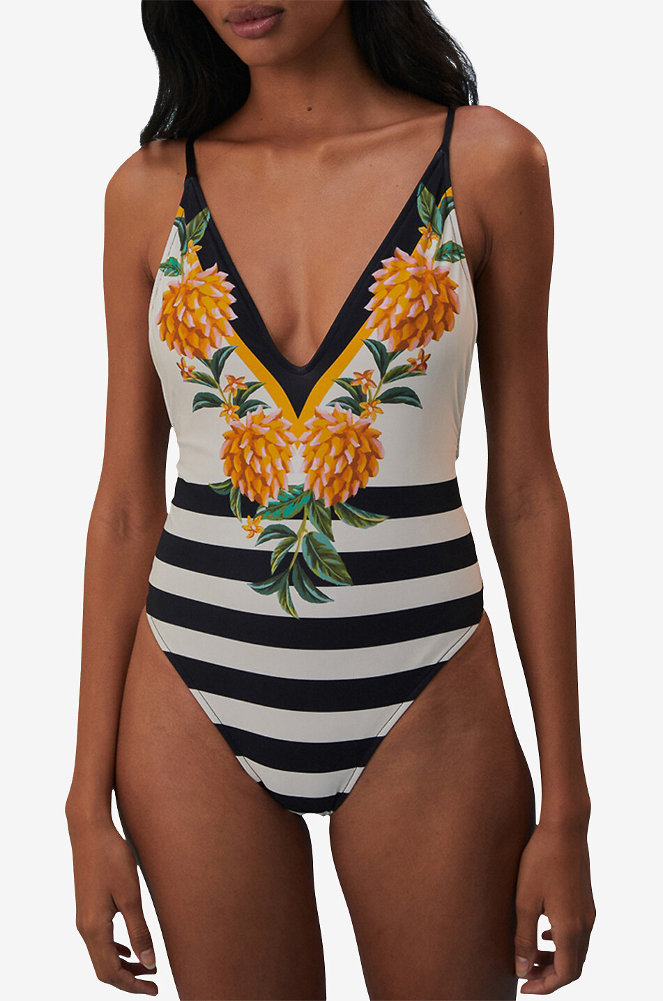 Verdrehen Sie Köpfe am Strand mit diesem femininen Retro-Badeanzug von FARM RIO! Der einteilige Badeanzug ist aus weichem und angenehm zu tragendem Lycra gefertigt. Maritime horizontale Streifen werden hier von exotischen Früchten ergänzt, die den tiefen V-Ausschnitt schön umrahmen.