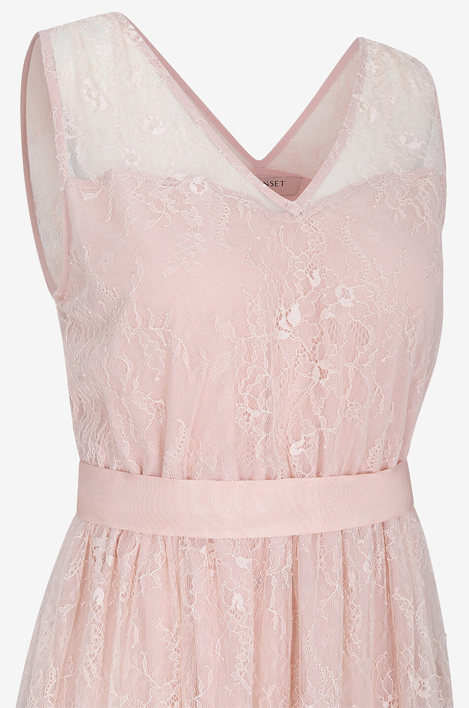 Glamourös und raffiniert - Das lange Kleid für Damen von TWINSET hat nur Gutes zu bieten. Sie werden sich sicherlich in die Spitze, den V-förmigen Kragen und Rücken, das Logo und den Bindegürtel auf der Rückseite und das ärmellose Design verlieben.