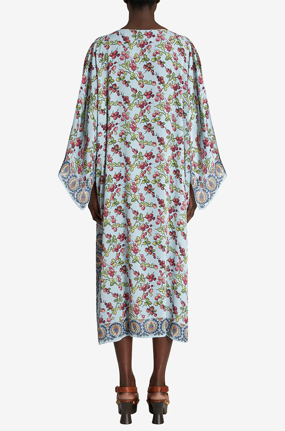 Swimsuit - check! Sandals - check! Straw hat - check! The only thing missing is a caftan to take to the bar whenever you want to cool off with a little cocktail! Opt for this fruity caftan by ETRO embellished with graphic berries and a paisley border. It's crafted from fluid viscose crepe, and features kimono sleeves and a round front split collar embellished with a tasselled tie.