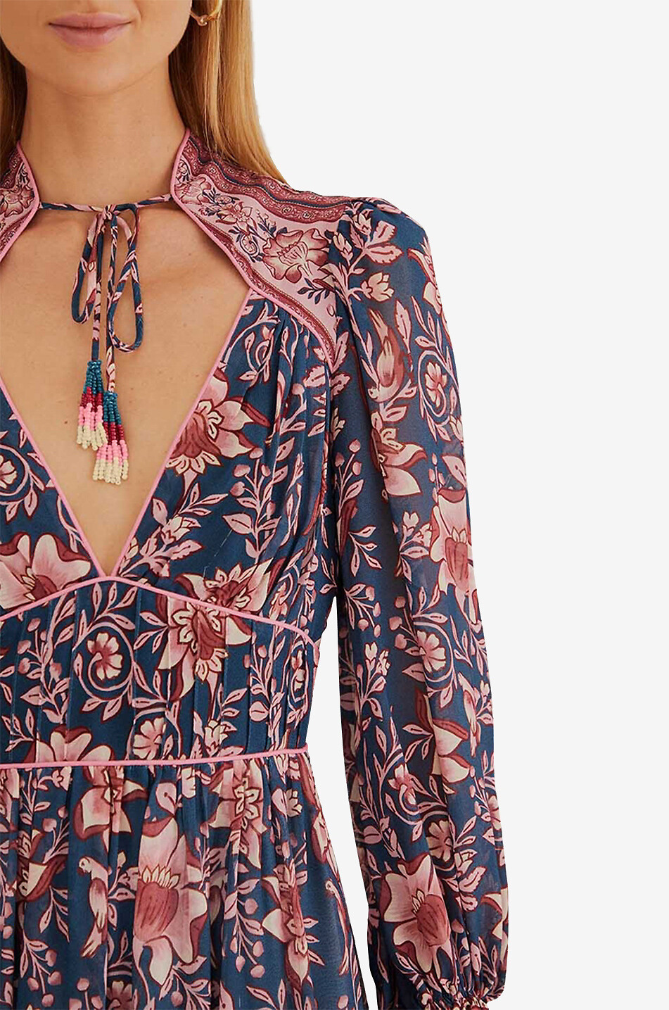 If you're planning a trip to the sun soon, complete your suitcase with chic thanks to this mini dress by FARM Rio. The fluid dress from the Cruise collection is made to show off your pretty legs and stunning cleavage on your strolls around town or on the beach, on the terrace or at the hotel bar. It is made from delicately sheer crepe, and is embellished with a floral print and piping, highlighting in particular the diamond-shaped neckline and the marked waist.