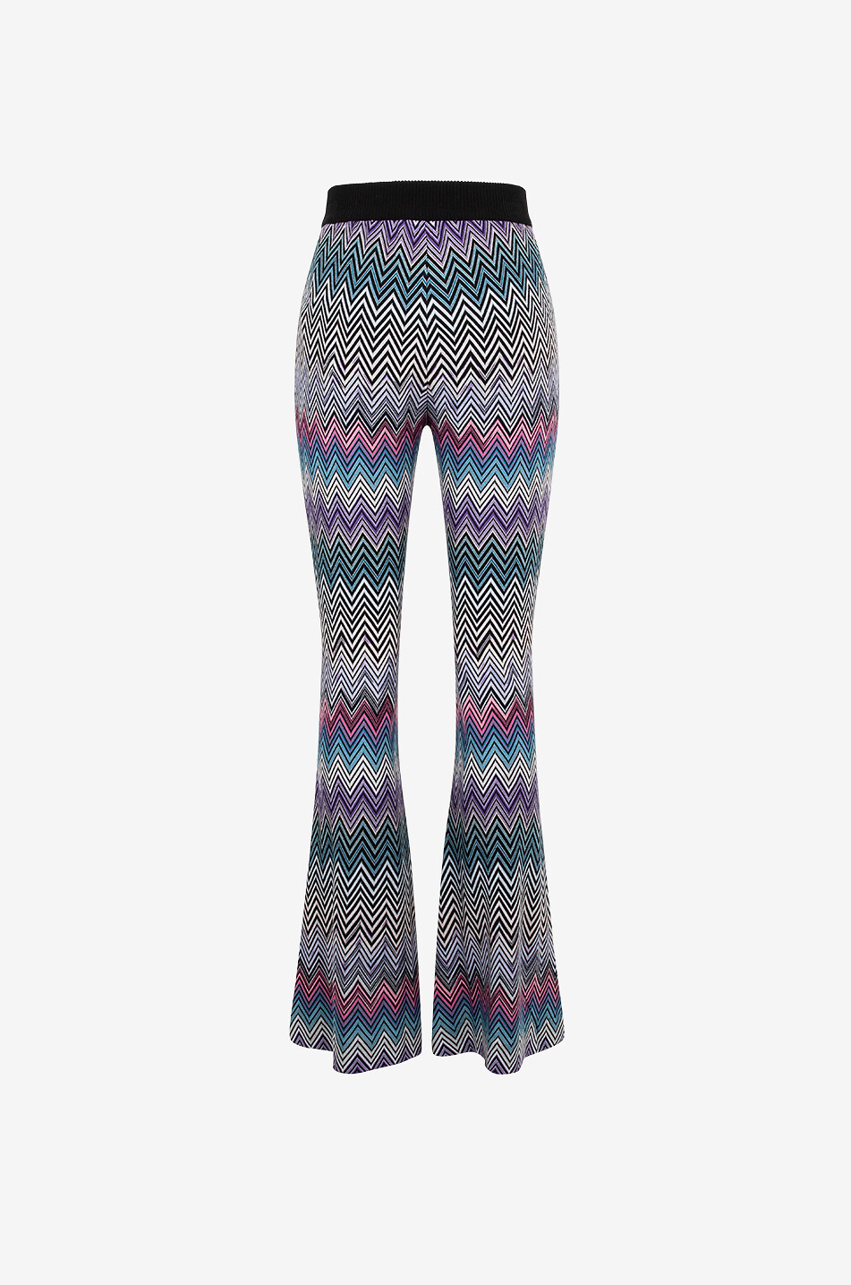 The '70s are back in your chic wardrobe this season with these flattering trousers by MISSONI. Fitted at the waist, hips and thighs, they flare out towards the ankles. The fine, shimmering knit is embellished with a wavy pattern. Wear yours with a sheath jumper and matching knitted coat.