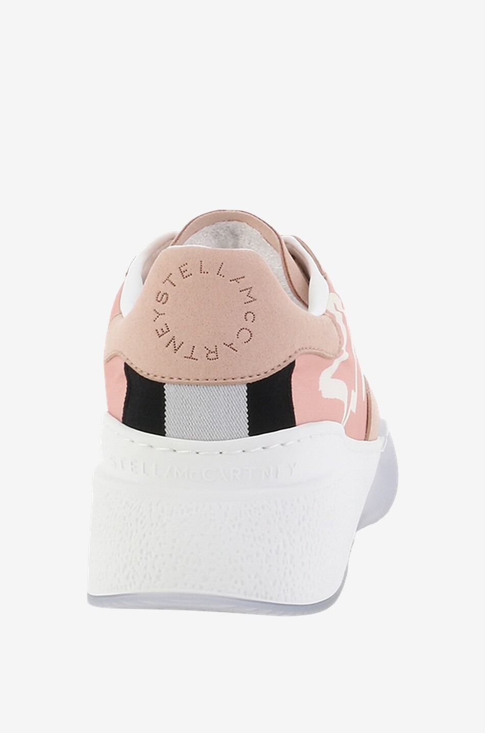 Get closer to the stars with these low-top lace-up sneakers from Stella McCartney! The comfortable eco-designed shoes are made entirely from recycled, non-leather materials: they are composed of nylon printed with the British brand's logo and signature pattern, synthetic suede and synthetic leather Alter Nappa. Their two-tone textured rubber wedges are sewn rather than glued, so that every part of the shoes can be recycled at the end of their life. The sneakers will boost your casual and chic outfits from Monday to Sunday.