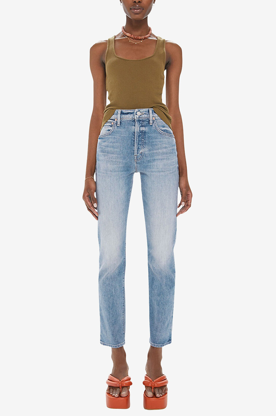 Portez le jean droit The Slim Stacked FRAME. Il se porte bien avec un top smocké à manches ballon ou avec un débardeur à bretelles.